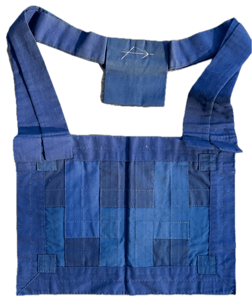 The flag will be composed of 195 individual rakusu faces stitched from black and blue jeans worn by members of my Brattleboro, VT community. The height of each rakusu face corresponds to the width of one of the US flag’s 13 stripes, requiring 13 rows of 15 rakusus to maintain the traditional dimensions of the US flag.